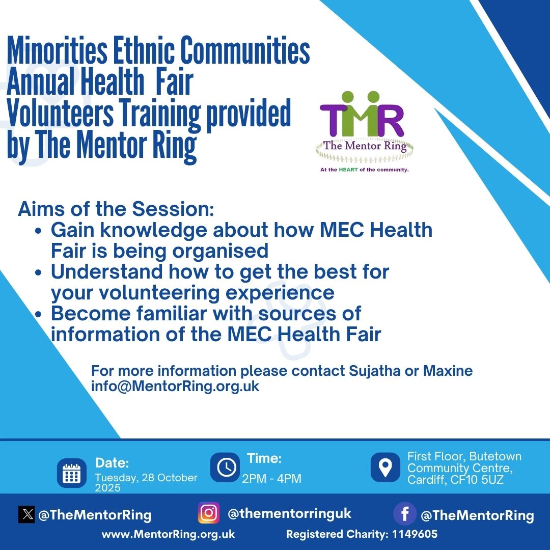 The MEC Health Fair Volunteer Training will be held on Tuesday, 28th October 2025, at 2:00pm to 4:00pm at the First Floor, Butetown Community Centre, Butetown, Cardiff, CF10 5UZ. This session will take place the day before the main event and will help volunteers become familiar with key information about the MEC Health Fair. Following the session, the volunteers will be invited to participate in a guided tour of the venue: the Fitzalan High School, Leckwith Road, Cardiff CF11 8AP.