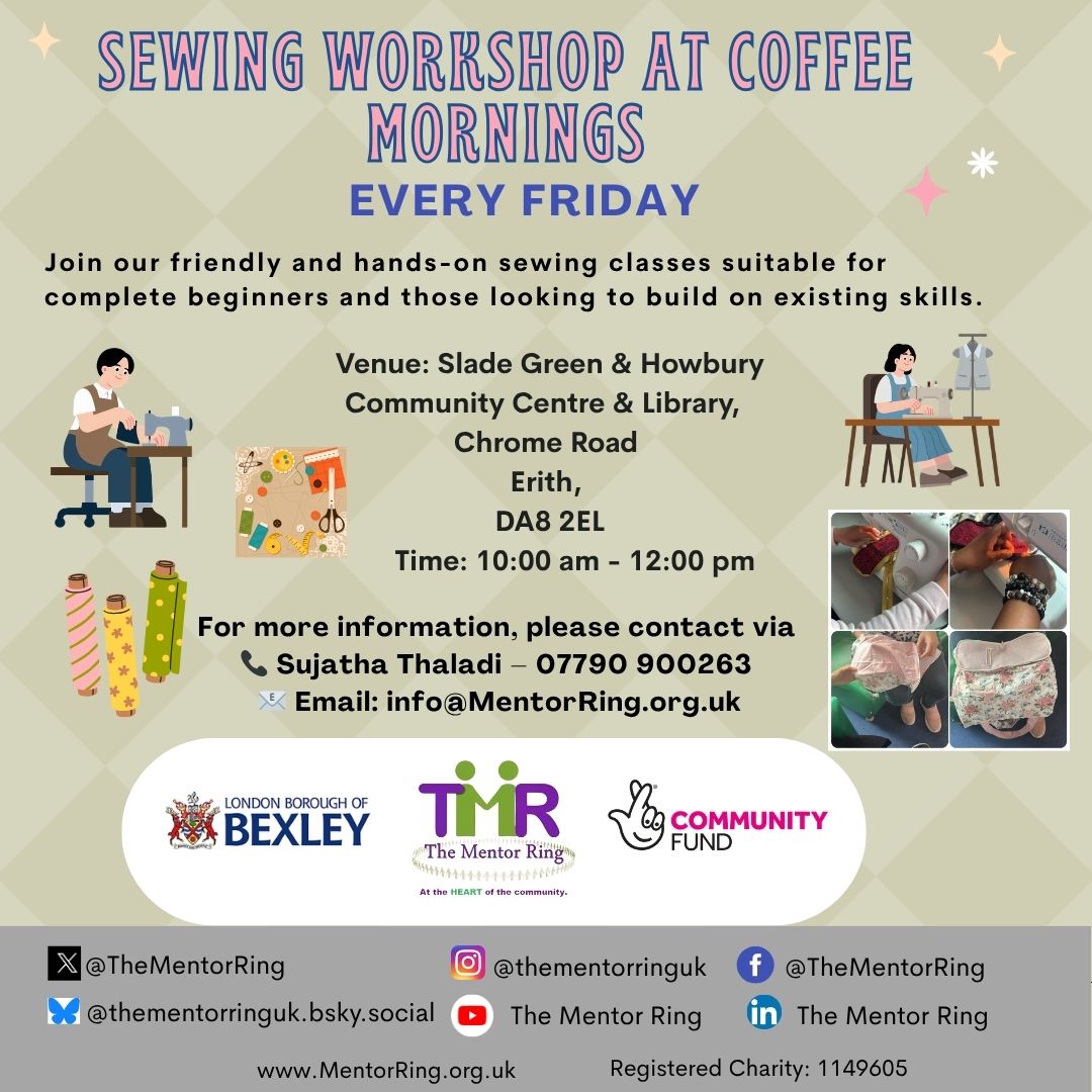 Sewing Workshop Classes at Coffee Mornings will take place every Friday, 24th April 2026, at Slade Green and Howbury Community Centre and Library, Chrome Rd, Erith, DA8 2EL, 10:00am – 12:00pm.