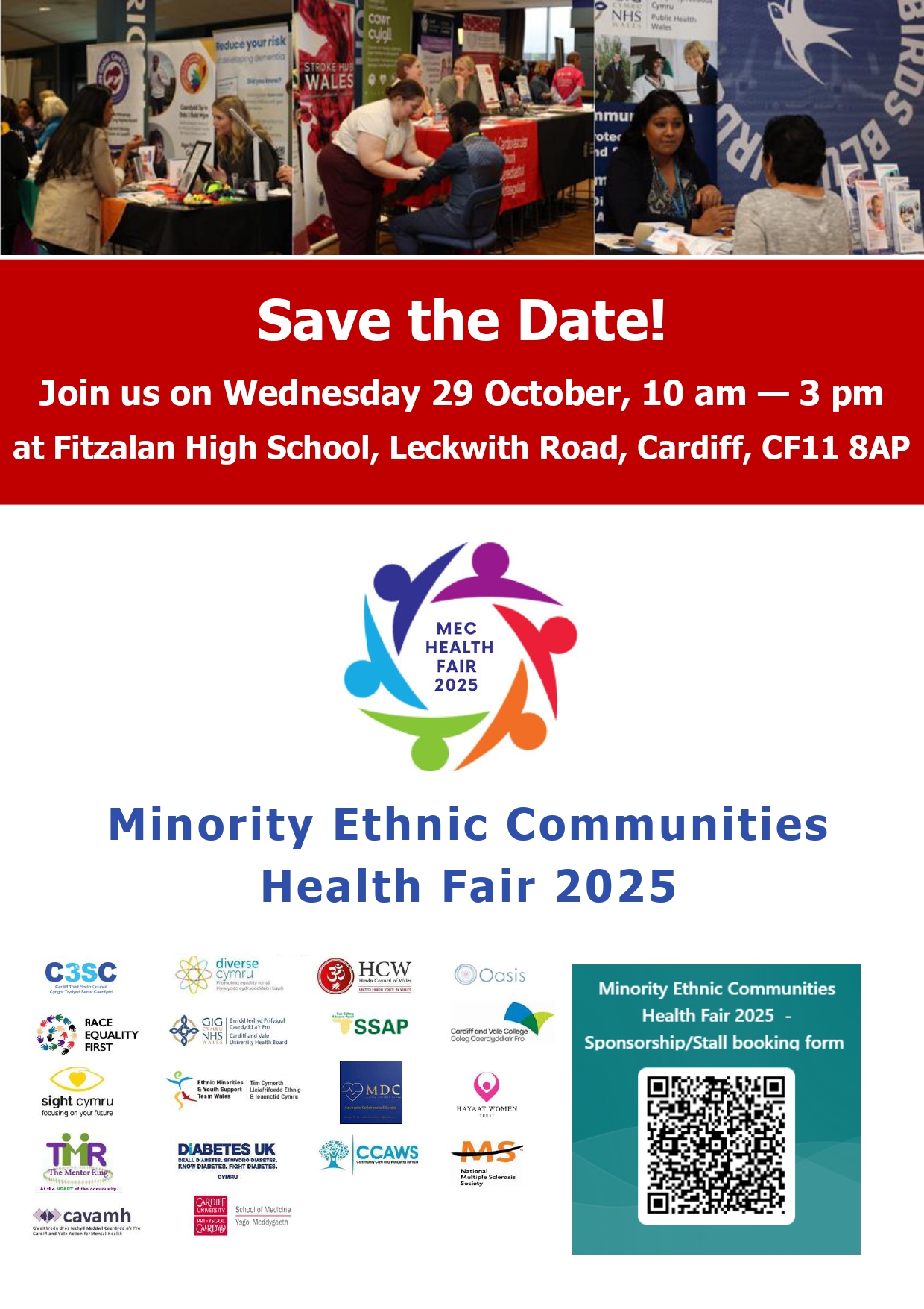 The Minority Ethnic Communities (MEC) Health Fair will take place on Wednesday 29th October 2025, from 10am – 3pm at Fitzalan High School, Cardiff Leckwith Road, Cardiff, CF11 8AP.