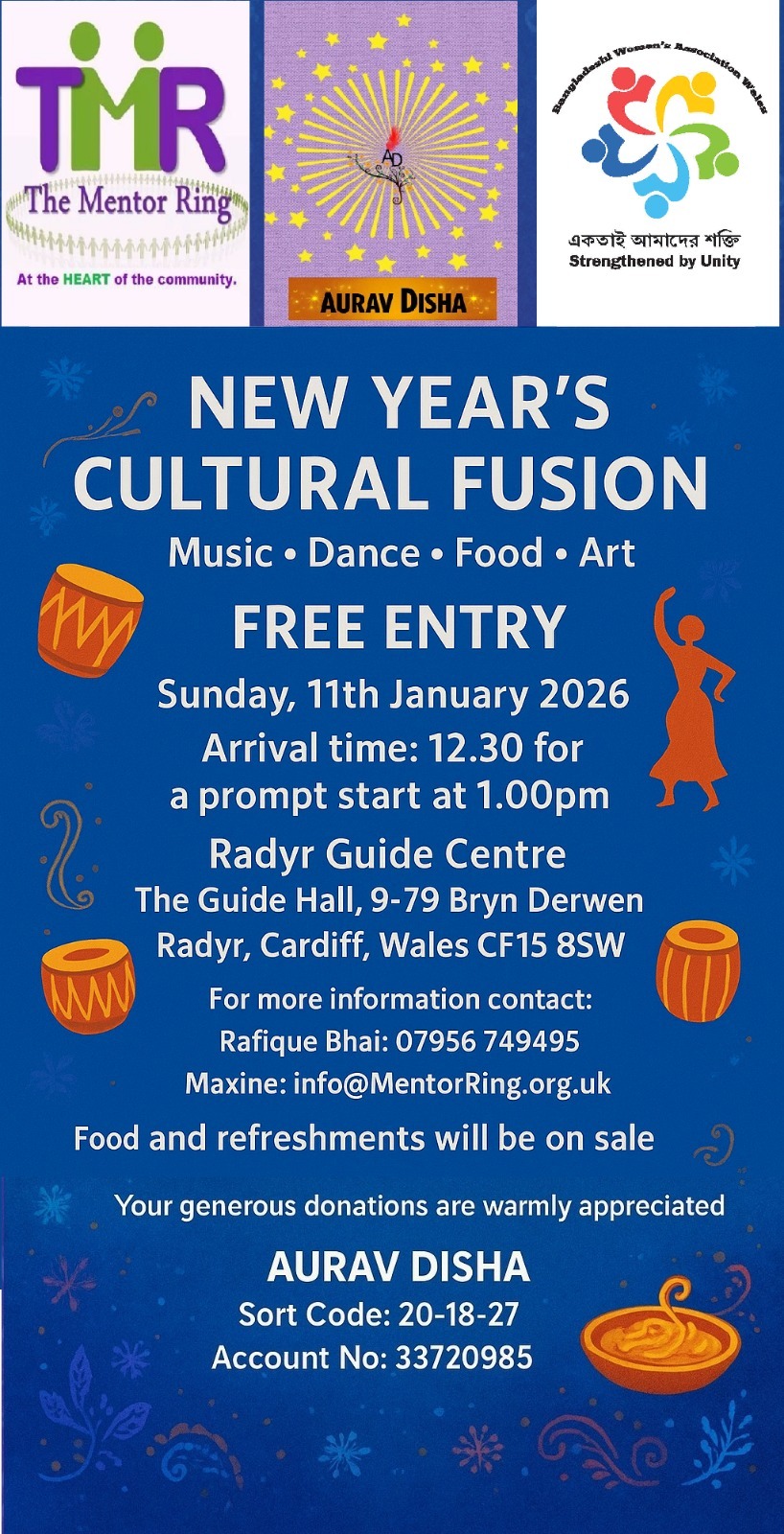 Radyr Guides Centre 9-79 Bryn Derwen, Cardiff, Cardiff, Radyr, United KingdomPlease join us for this event as TMR in collaboration with Aurav Disha are organising a New Years cultural fusion event on Sunday 11th January 2026, 1.00 pm start at the Radyr Guides Centre, 9 – 79, Bryn Derwen, Radyr, CF15 8RP. Free entry for this event and refreshments are on for sale.